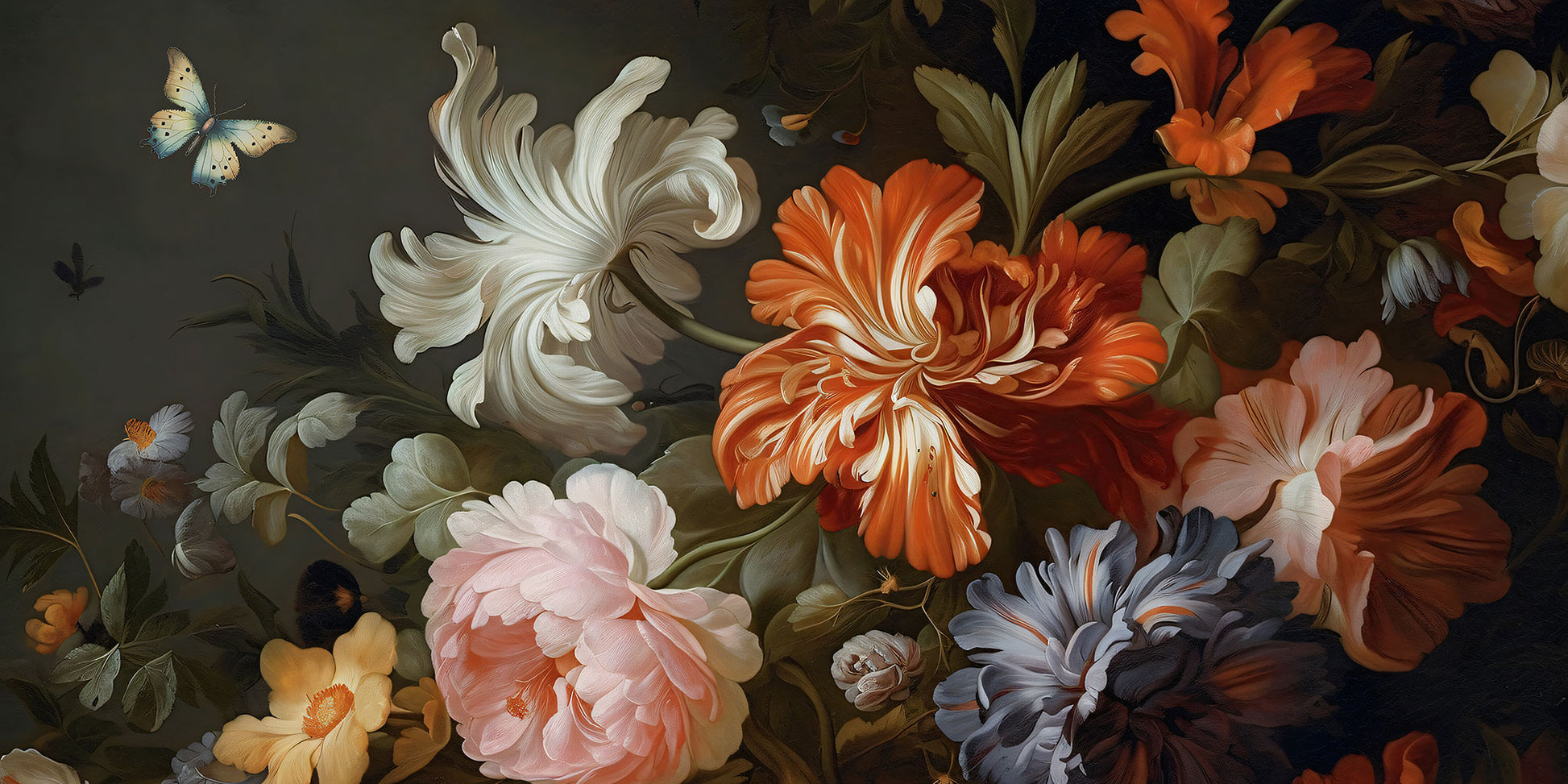 Na ciemnym tle rozkwitają pełne, mięsiste kwiaty – w odcieniach głębokiego pomarańczu, kremowej bieli, delikatnego różu i stonowanego błękitu. Wyglądają, jakby ktoś namalował je pędzlem zrobionym z zachodzącego słońca. Każdy płatek ma w sobie odrobinę światła, jakby zapamiętał ostatni promień dnia.