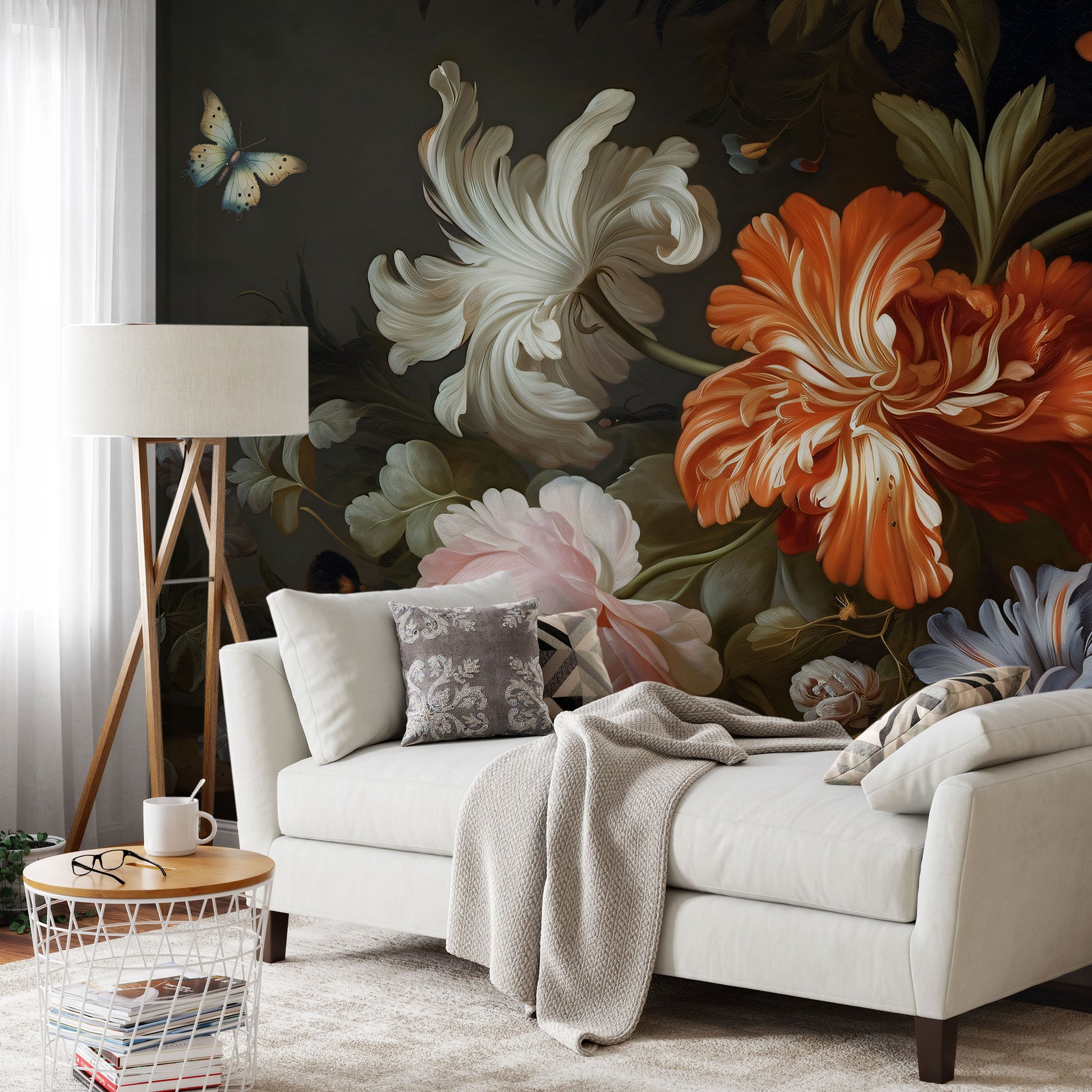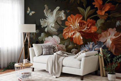 Kolorystyka to czysta magia kontrastów: ciepłe tony kwiatów spotykają chłodny, nocny cień. Efekt? Tapeta, która przyciąga wzrok, ale nie potrzebuje reflektorów. Wystarczy jedno spojrzenie, żeby poczuć, że wnętrze zyskuje głębię i teatralny nastrój – bez kiczu i patosu.