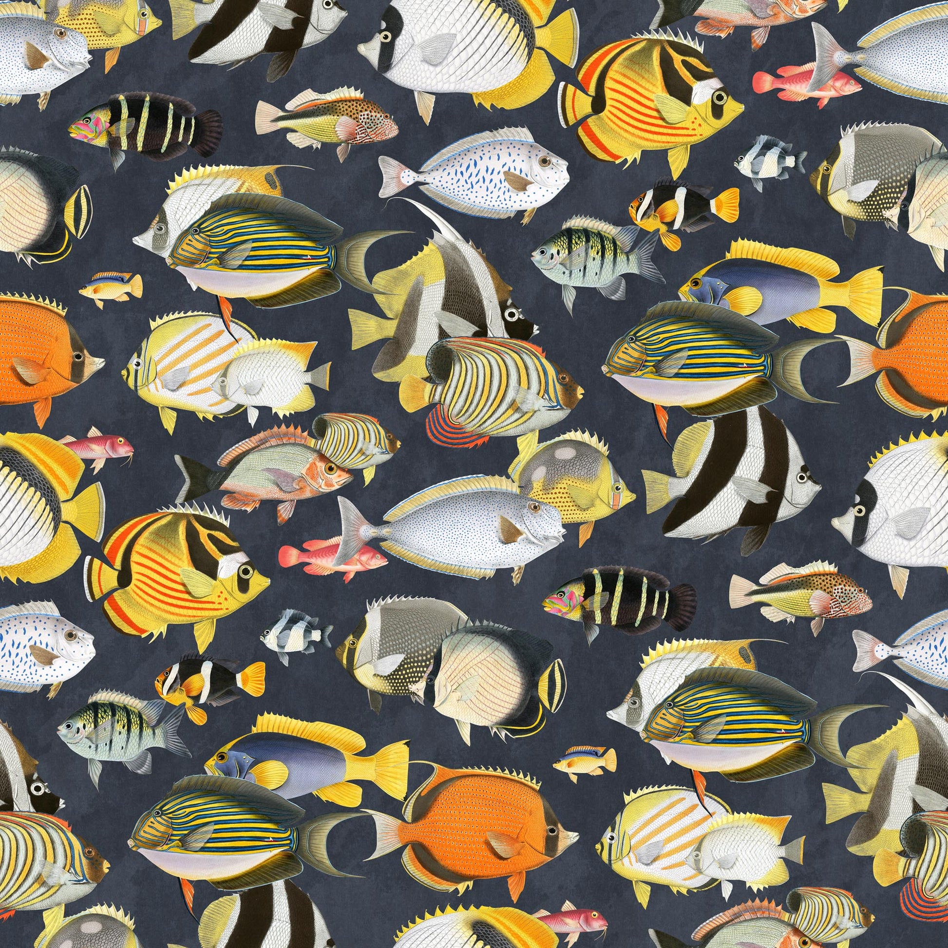 Na ciemnym tle, przypominającym głębię oceanu, unoszą się dziesiątki barwnych ryb: pomarańczowych, żółtych, srebrnych i czarno-białych. Każda z nich ma swój charakter – jedna wygląda, jakby właśnie wygrała konkurs na najpiękniejsze płetwy, inna jak typ, który zawsze pływa pod prąd. Całość układa się w rytmiczny, wesoły wzór, który tętni życiem jak wakacje w tropikach.