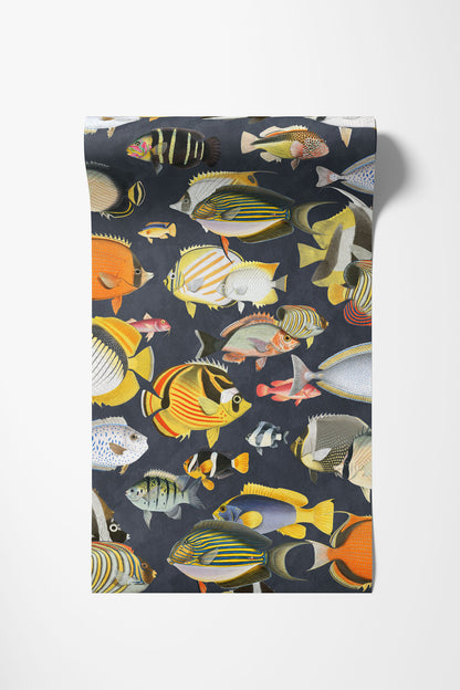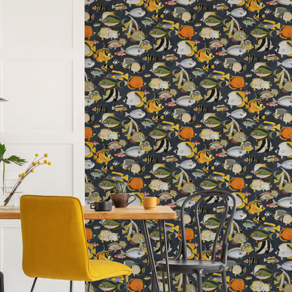 Kolorystyka to miks energii i spokoju: głęboki granat daje tło niczym nocne niebo nad morzem, a rybie barwy – pomarańcze, żółcie, zielenie i biele – dodają światła i optymizmu. To ten typ tapety, która rozchmurzy każdy poranek, nawet jeśli kawa się skończyła.