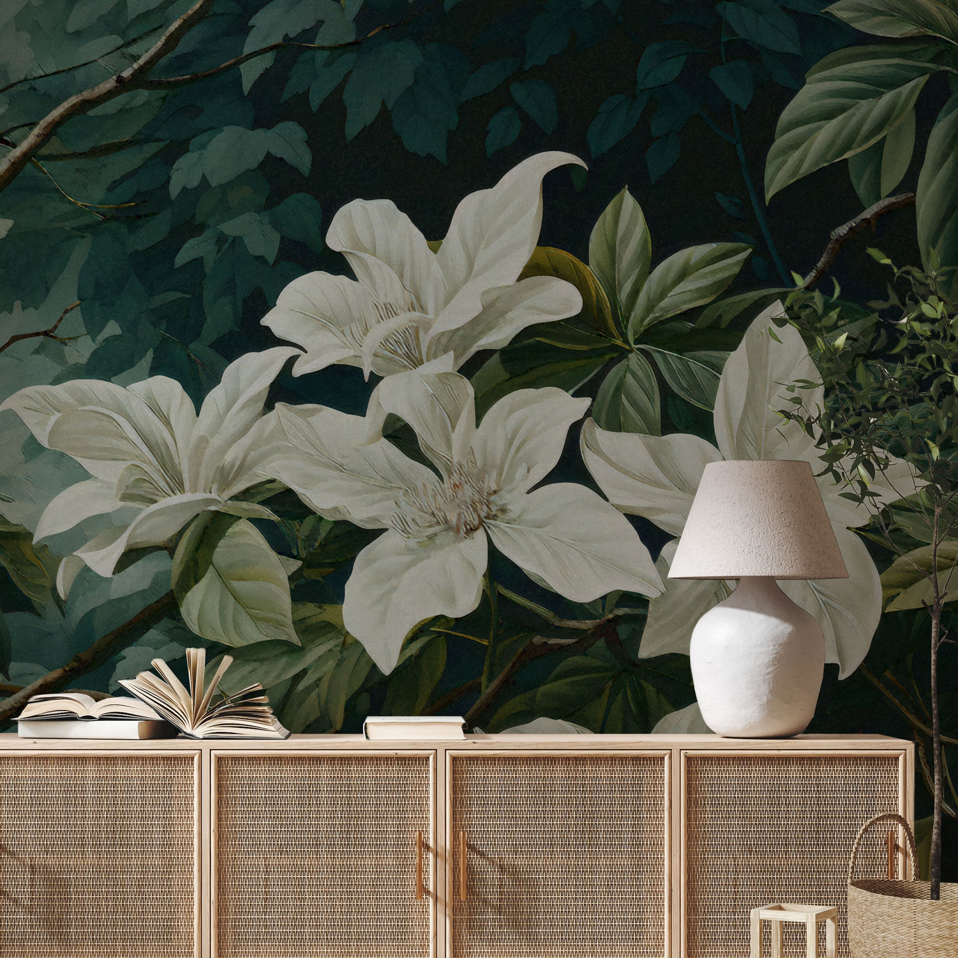 Wzór przedstawia rozłożyste gałęzie z liśćmi i dużymi, kremowymi kwiatami, które wyglądają jak namalowane światłem. Delikatne cienie, miękkie przejścia barw i realistyczne detale tworzą efekt głębi — jakby za chwilę miała przelecieć między nimi ważka. To tapeta, która wprowadza harmonię, nawet jeśli za oknem panuje totalny chaos.