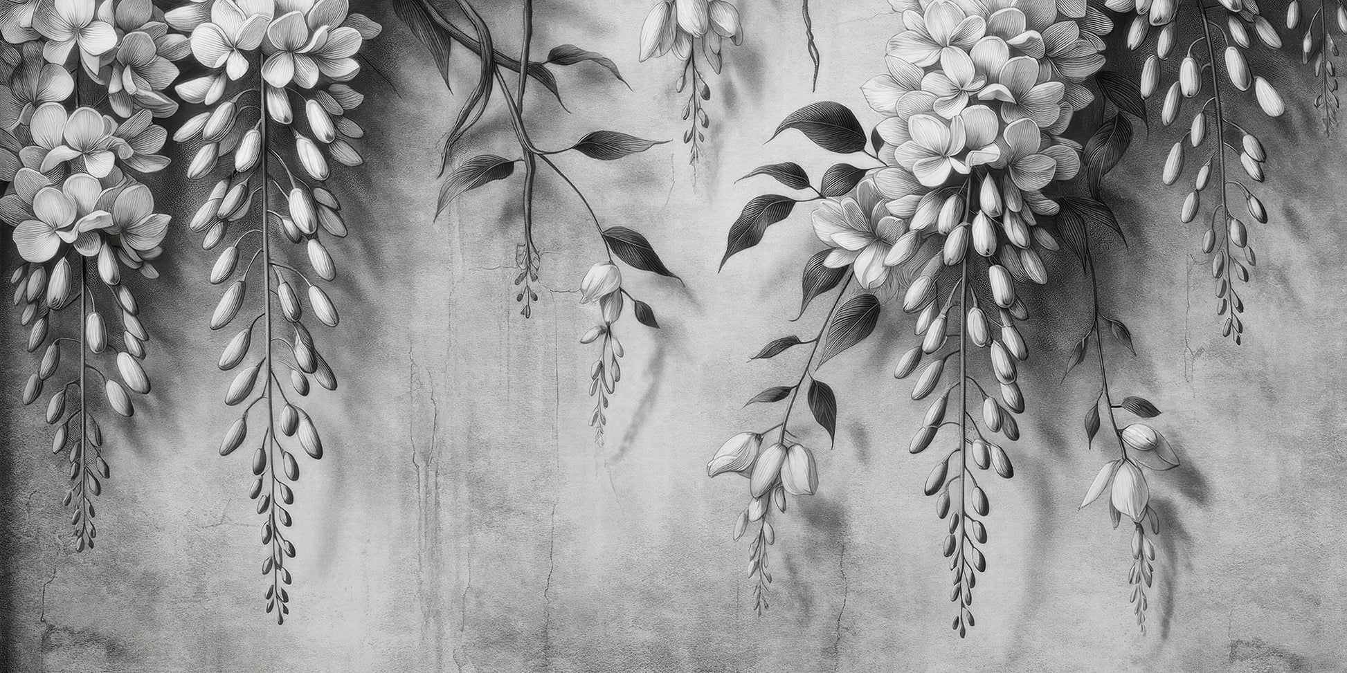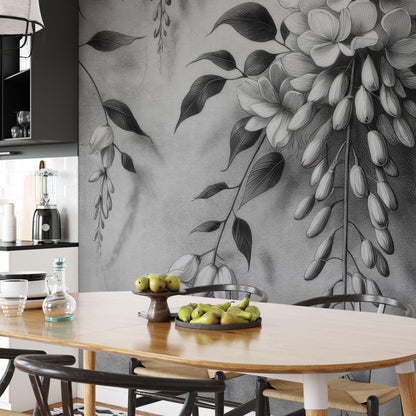 Wzór przedstawia subtelne, rysunkowe kwiaty zwisające miękko niczym pnącza glicynii. Cieniowane płatki i lekko postarzone tło tworzą efekt głębi, jakby ściana miała swoją własną historię – trochę romantyczną, trochę tajemniczą. To wzór, który nie krzyczy – on po prostu szepcze w dobrym stylu.