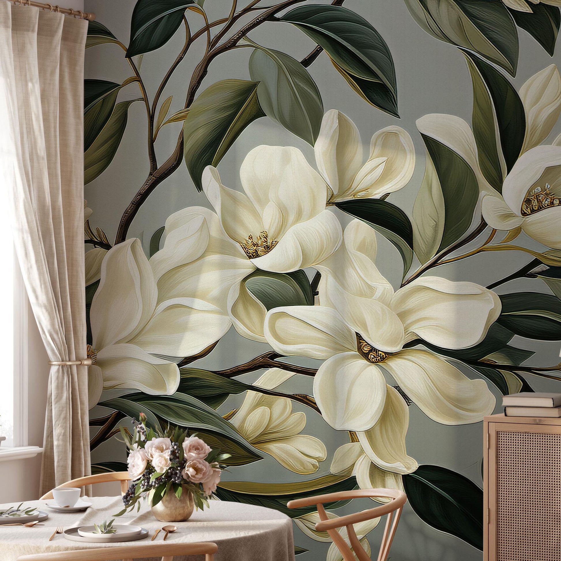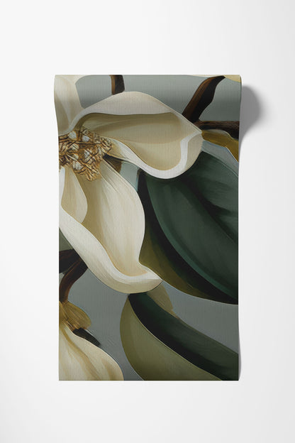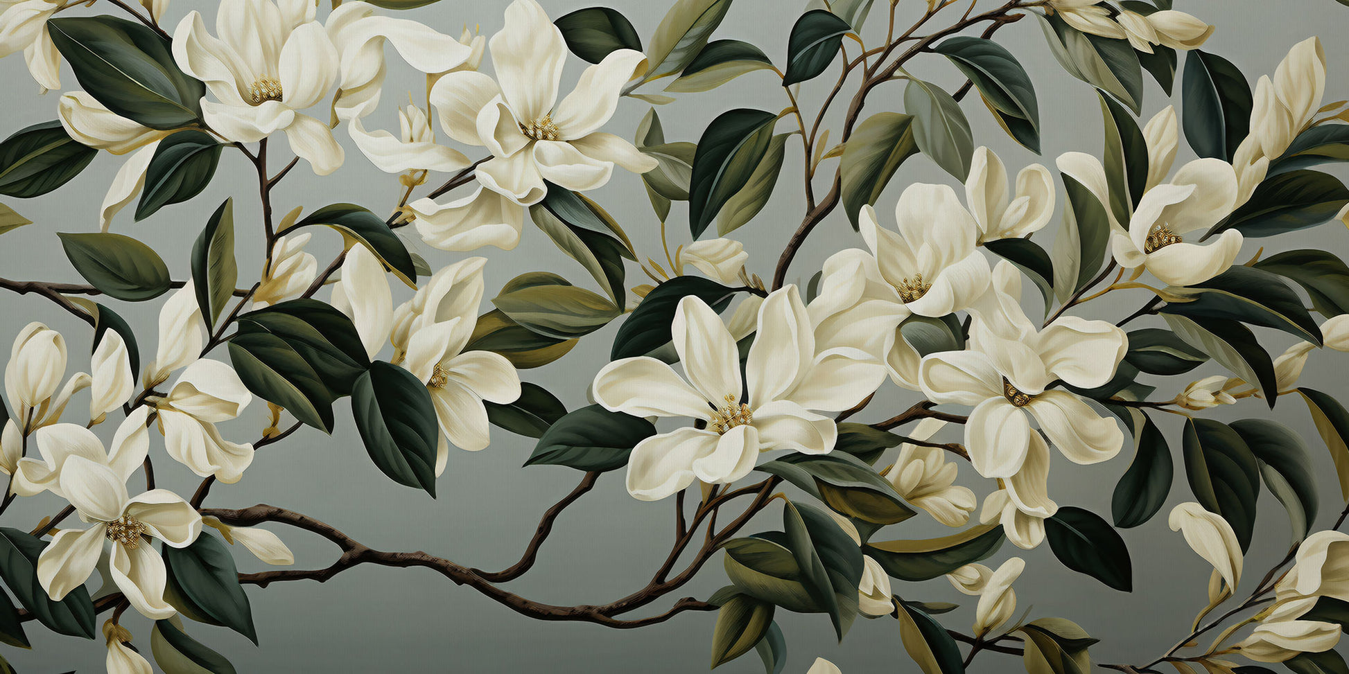 Na tle delikatnej, szarozielonej poświaty rozkwitają duże, kremowe kwiaty magnolii. Ich płatki wyglądają, jakby ktoś namalował je pędzlem zanurzonym w świetle – miękkie, pełne głębi, z pięknym przejściem tonów. Liście o bogatej zieleni i złamanych oliwkowych odcieniach dodają kompozycji naturalnego rytmu. „Emma” nie przytłacza – raczej otula przestrzeń spokojem i harmonią.