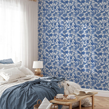 Wzór to misterna, gęsta kompozycja roślin i ptaków, narysowanych z precyzją godną tatuażu na porcelanie. Każdy detal żyje tu własnym rytmem, tworząc hipnotyzujący, niemal ornamentalny układ. Efekt? Tapeta, która przyciąga wzrok, ale nie męczy – można na nią patrzeć godzinami i wciąż odkrywać coś nowego.