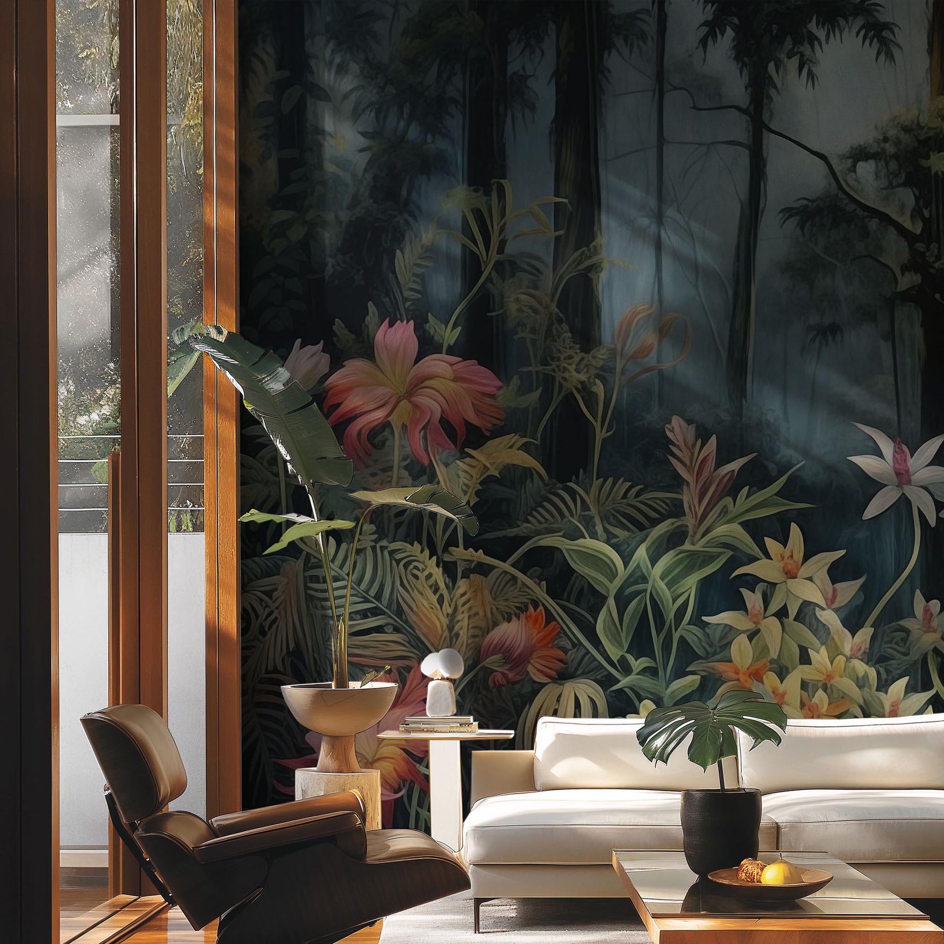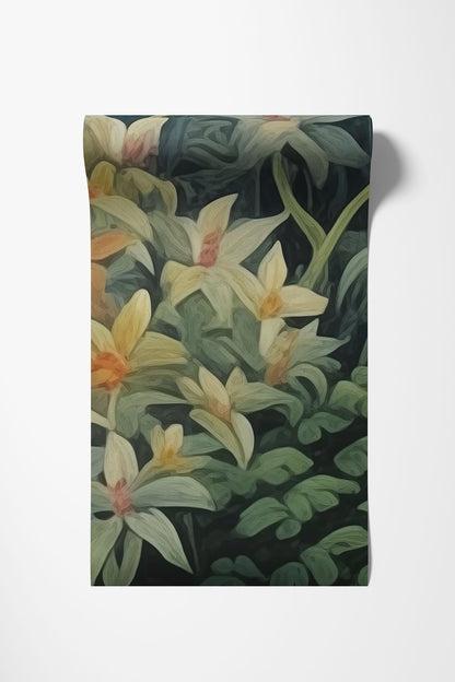 Wzór tętni życiem – soczyste liście paproci i monstery łączą się z kwiatami orchidei i amarylisów w delikatnej mgiełce porannego światła. Głębia perspektywy tworzy iluzję przestrzeni, dzięki czemu ściana nabiera trójwymiarowego charakteru. To tapeta, która nie tylko zdobi, ale dosłownie oddaje oddech natury.