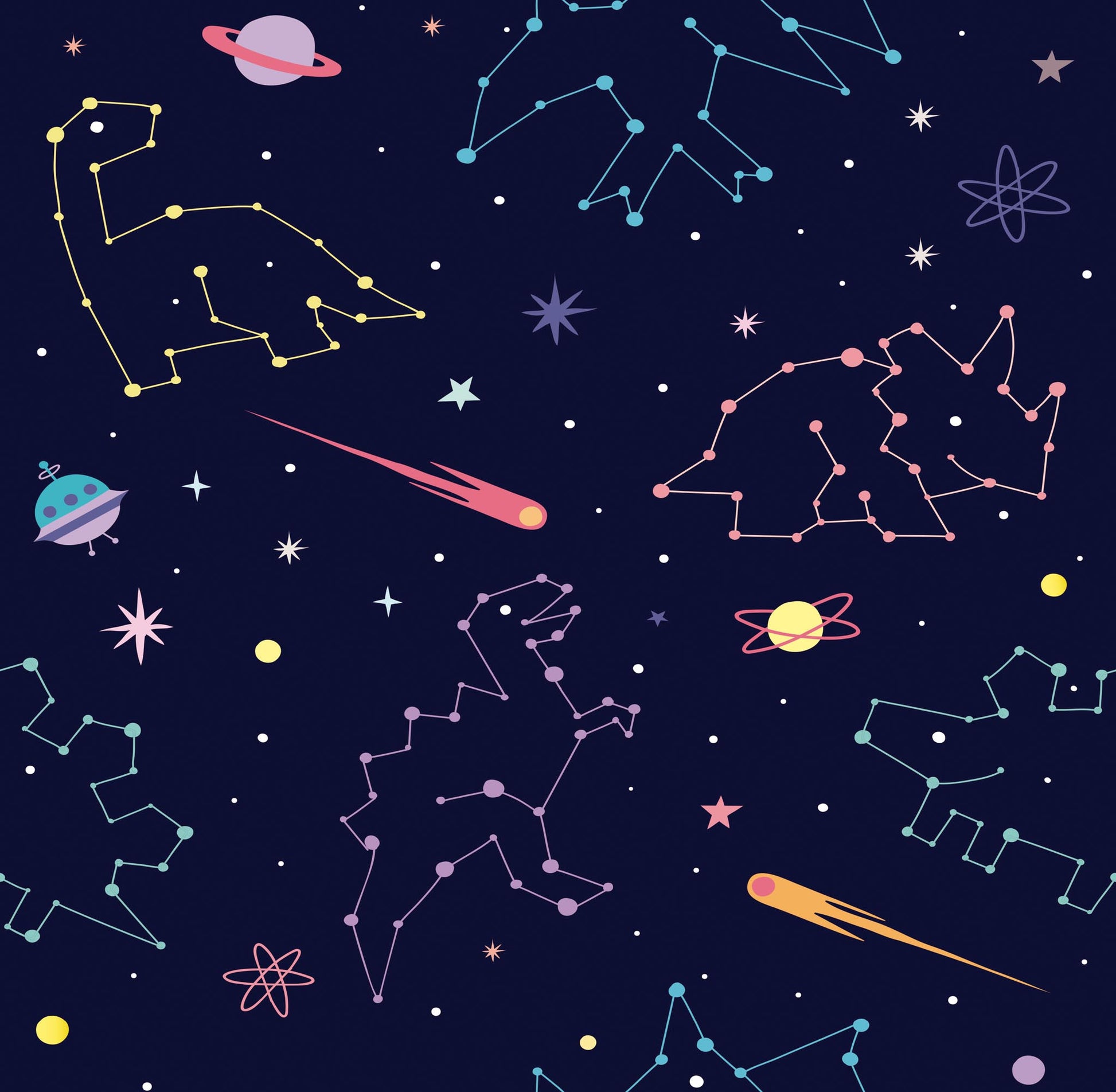 „Galaxy Dino” to tapeta, która łączy dwa dziecięce marzenia: podróż w kosmos i fascynację dinozaurami. Na granatowym, nocnym niebie świecą konstelacje w kształcie prehistorycznych gigantów – T-Rexa, triceratopsa i diplodoka – jakby ktoś narysował je gwiazdami. Między nimi mkną komety, planety i kolorowe gwiazdy, tworząc scenę prosto z dziecięcej wyobraźni.