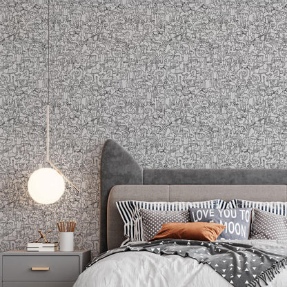 „Groovy Doodles” to manifest wolności i kreatywności. Ręcznie rysowany wzór pełen abstrakcyjnych linii, postaci i geometrycznych form tworzy artystyczny chaos, który przyciąga uwagę i dodaje wnętrzu wyjątkowej energii.