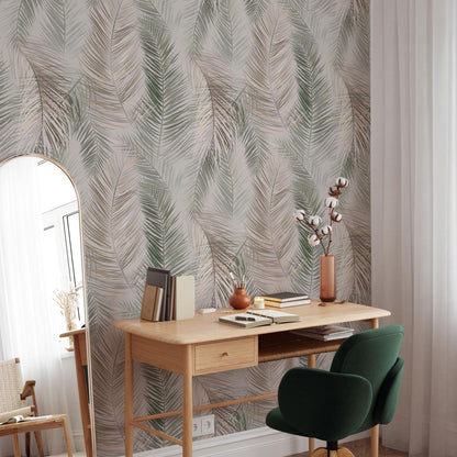 „Lucy Beige” to tapeta, która przyciąga swoją delikatnością i ponadczasowym urokiem. Wzór inspirowany strukturą liści palmowych układa się w harmonijny rytm, tworząc efekt miękkiego ruchu i naturalnej lekkości.