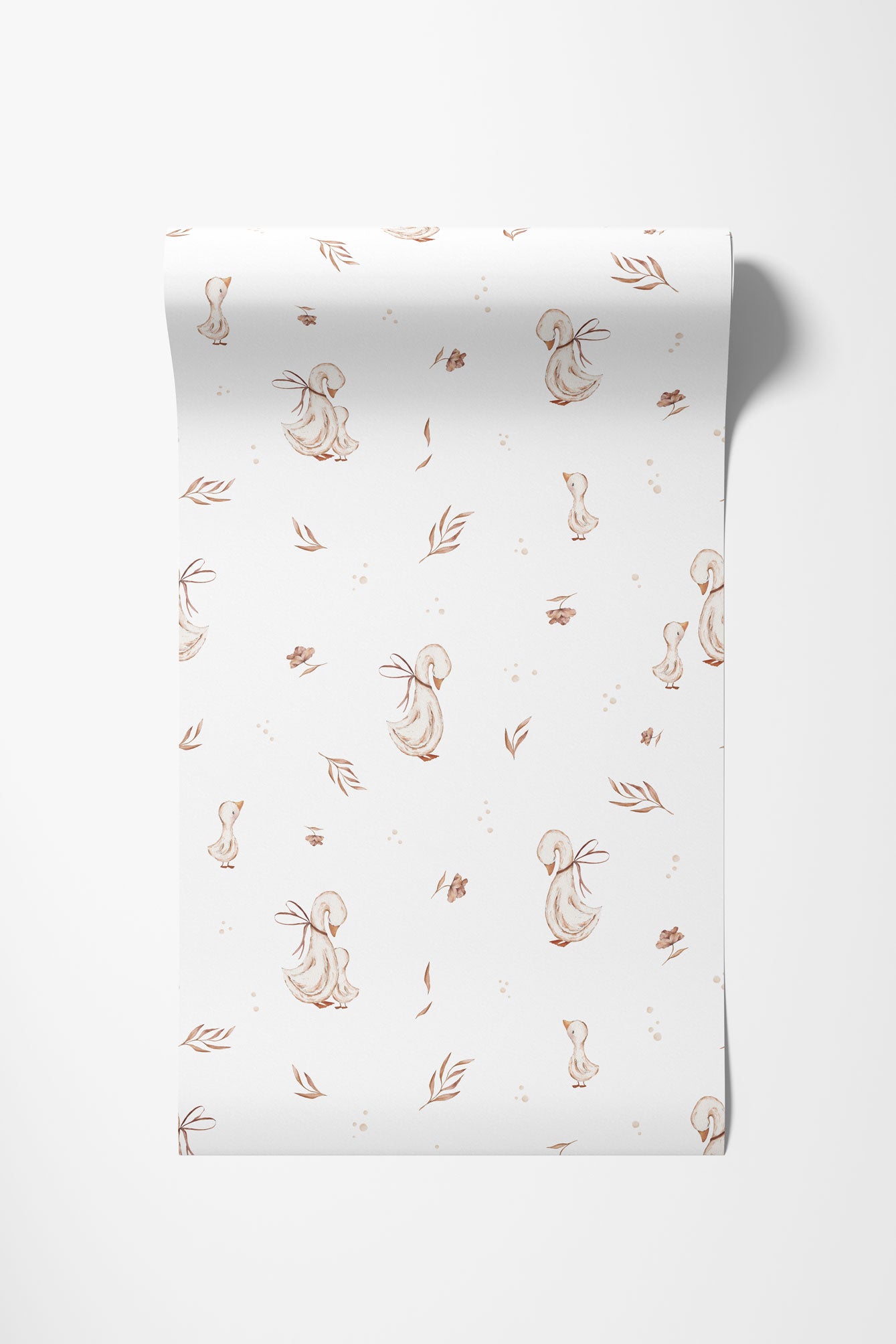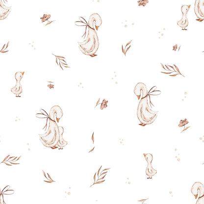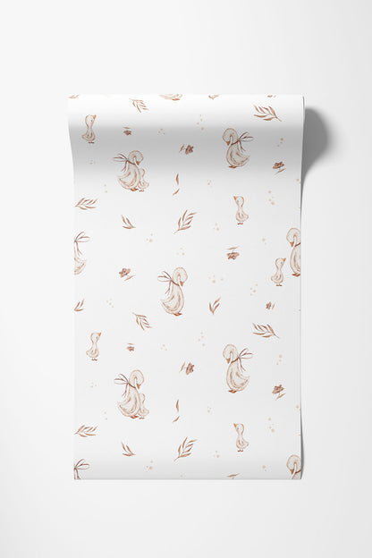 „Mommy Goose” to urocza, subtelna tapeta inspirowana światem najmłodszych – pełnym czułości, spokoju i miłości. Na jasnym tle pojawiają się delikatne ilustracje gęsi i piskląt, otoczone maleńkimi listkami i naturalnymi detalami w ciepłych, beżowych tonacjach.