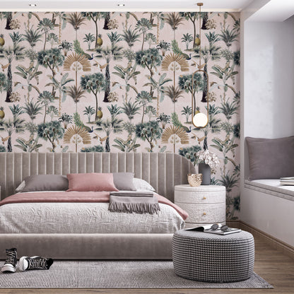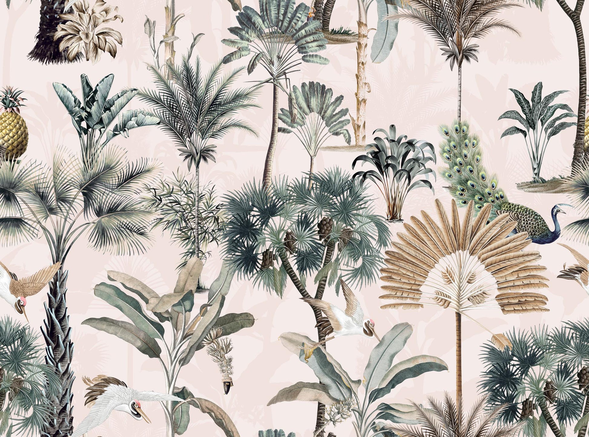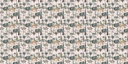 „Oasis Sand” to tapeta, która przenosi wnętrze wprost do egzotycznego ogrodu pełnego palm, bananowców i ptaków wśród miękkich, pastelowych tonów. Subtelna paleta beżu, zieleni i złamanych brązów sprawia, że wzór emanuje spokojem i naturalną elegancją.