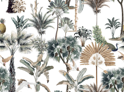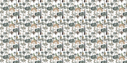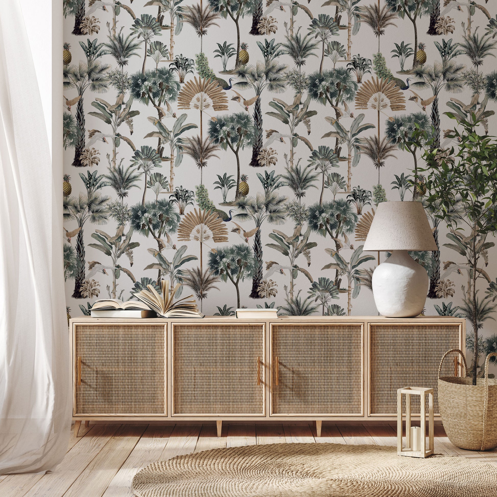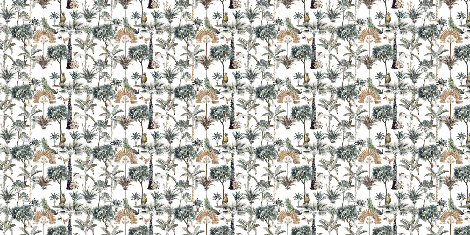 „Oasis White” to tapeta, która wprowadza do wnętrza klimat egzotycznej oazy w najbardziej subtelnym, eleganckim wydaniu. Na jasnym tle rozwijają się delikatne ilustracje palm, bananowców i pawich piór – narysowane z artystyczną precyzją i utrzymane w naturalnej palecie zieleni, beżu i złamanych brązów.