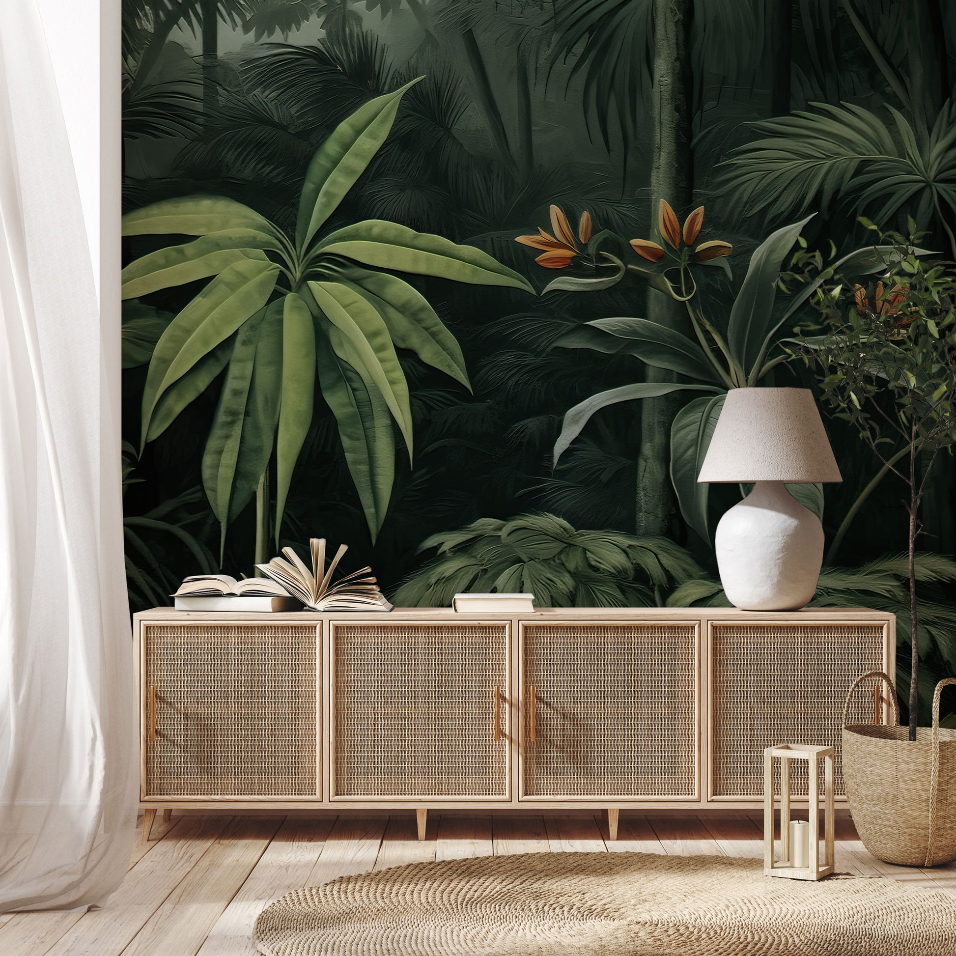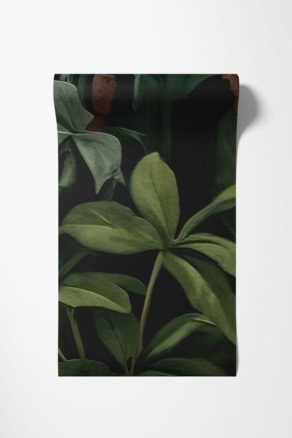 Jej wzór to bujna kompozycja roślin, liści i egzotycznych pędów, które tworzą wielowarstwową głębię. Ciemna zieleń tła otula jak cień pod palmą, a pojedyncze akcenty – pomarańczowe kwiaty czy złamane odcienie mchu – dodają jej życia i naturalnego rytmu. To tapeta, która nie krzyczy – ona działa powoli, budując nastrój spokoju, elegancji i tajemnicy.