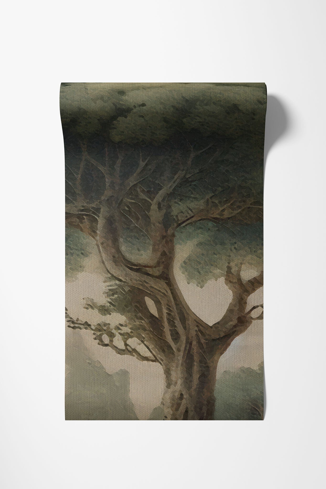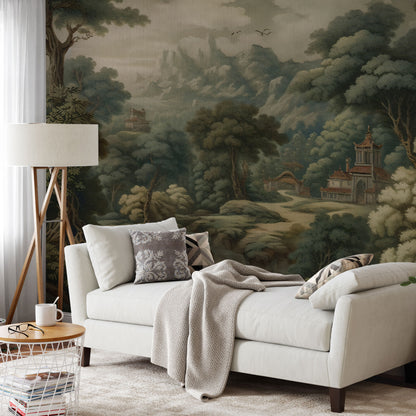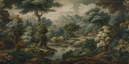 Wzór przedstawia rozległy krajobraz – z tajemniczymi świątyniami ukrytymi wśród gór i drzew, leniwie płynącą rzeką i miękkim światłem przebijającym się przez mgłę. Wszystko tu jest harmonijne – zieleń miesza się z brązem i szarością, tworząc obraz, który wygląda jak malowany tuszem na starym papierze. To nie tapeta, to spokój zamknięty w obrazie.