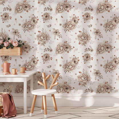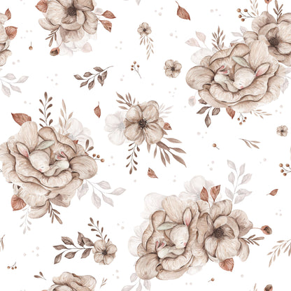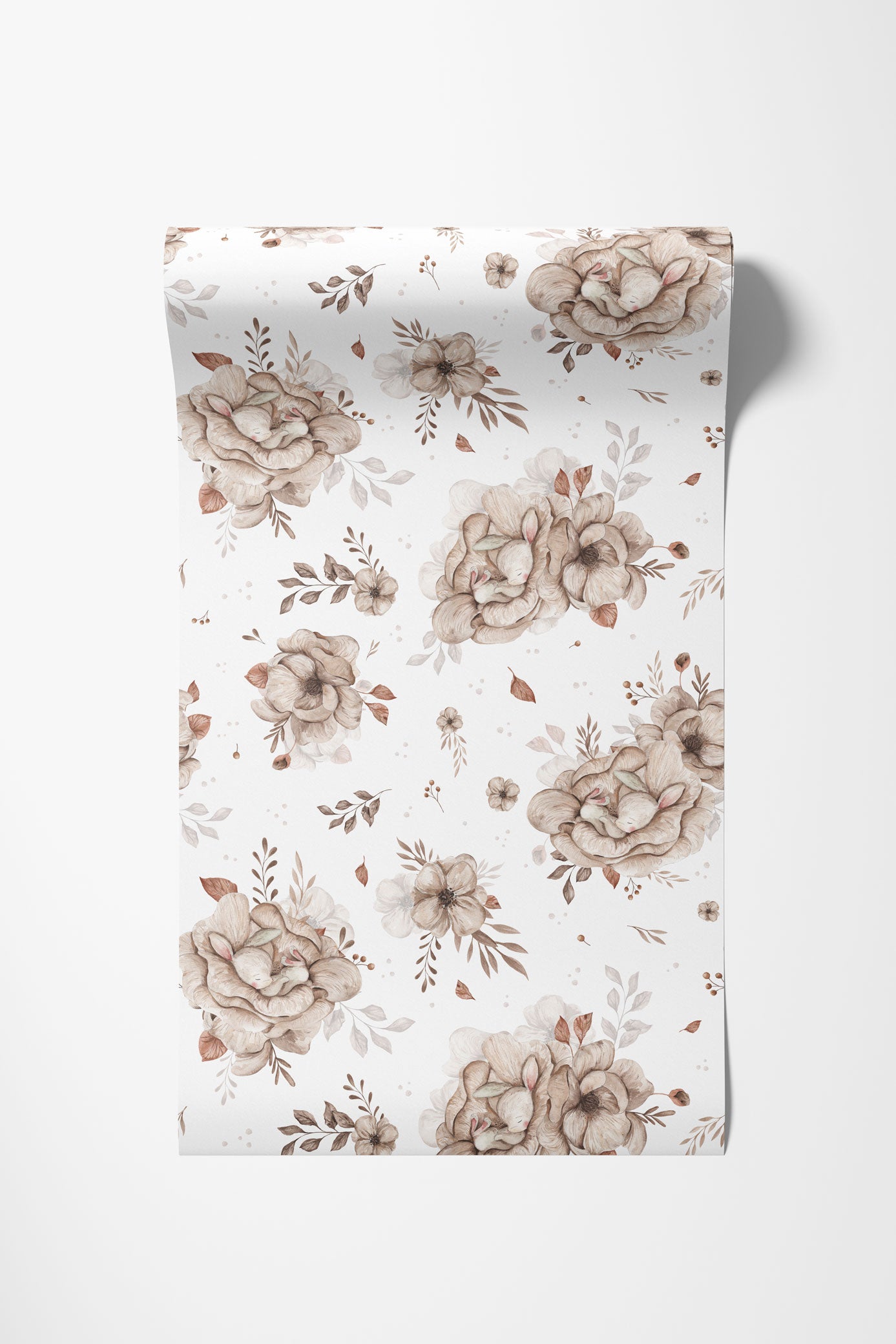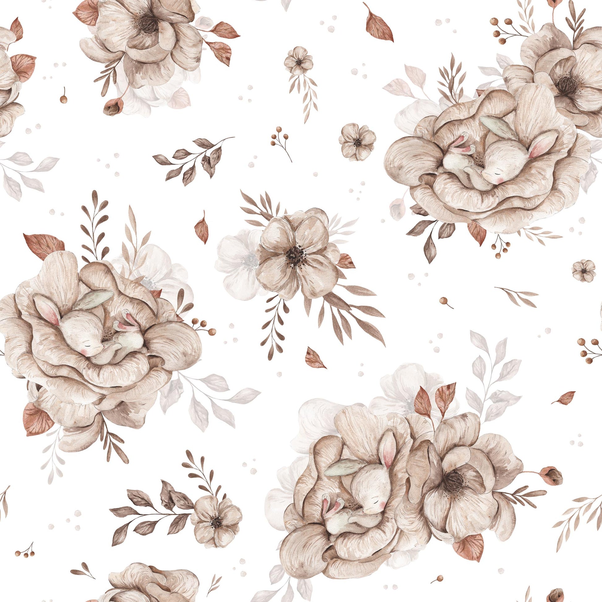 Na tle o lekkim, kremowym odcieniu rozkwitają akwarelowe bukiety w odcieniach beżu, ecru i delikatnego brązu. Wśród nich ukryte są śpiące króliczki – spokojne, wtulone w kwiaty, jakby właśnie zasnęły w wiosennej łące. Całość utrzymana jest w miękkiej, pastelowej tonacji, która koi wzrok i buduje atmosferę bezpieczeństwa.