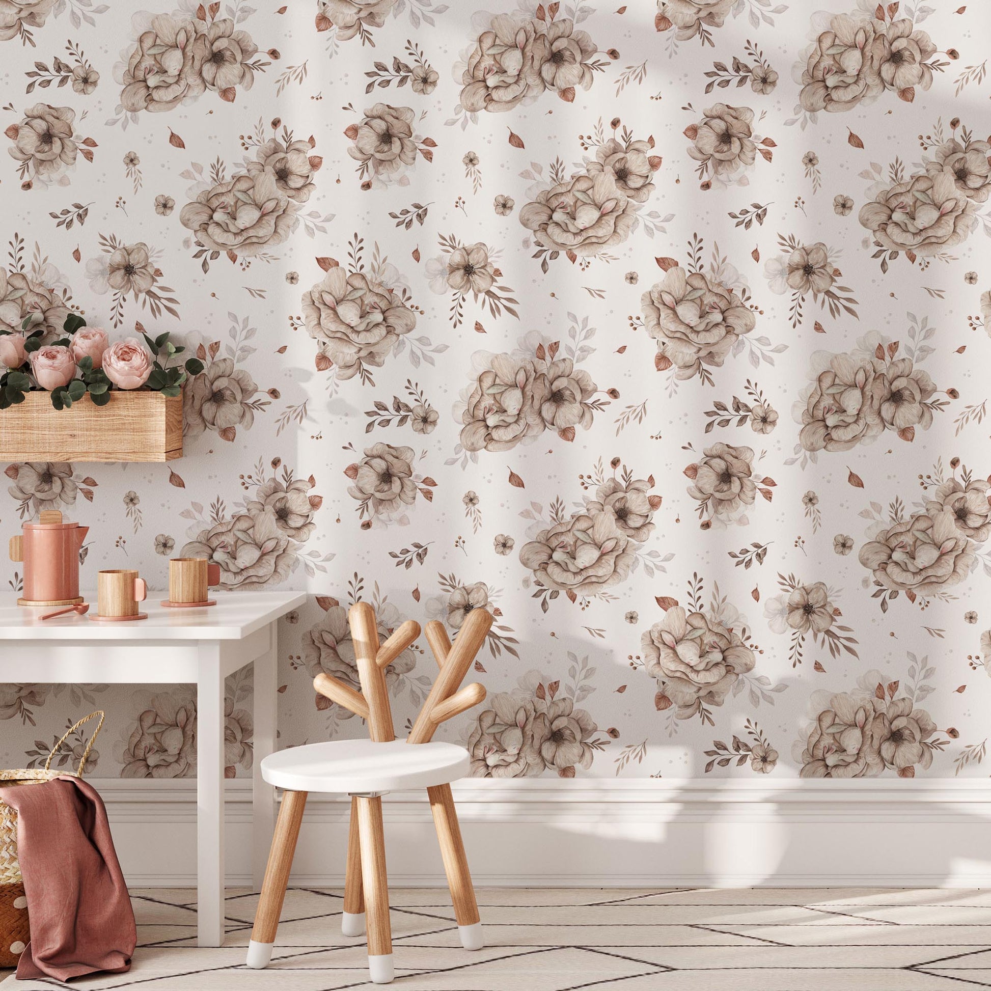 Kolorystyka „Sleepy Bunny” to paleta ciepłych, naturalnych barw – kremy, cappuccino, wanilia i szczypta różu. Dzięki temu tapeta doskonale komponuje się z jasnym drewnem, naturalnymi tkaninami i minimalistycznym wystrojem.