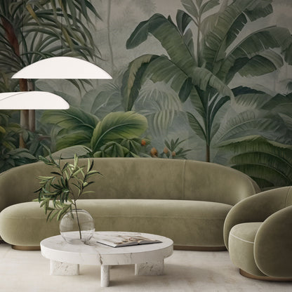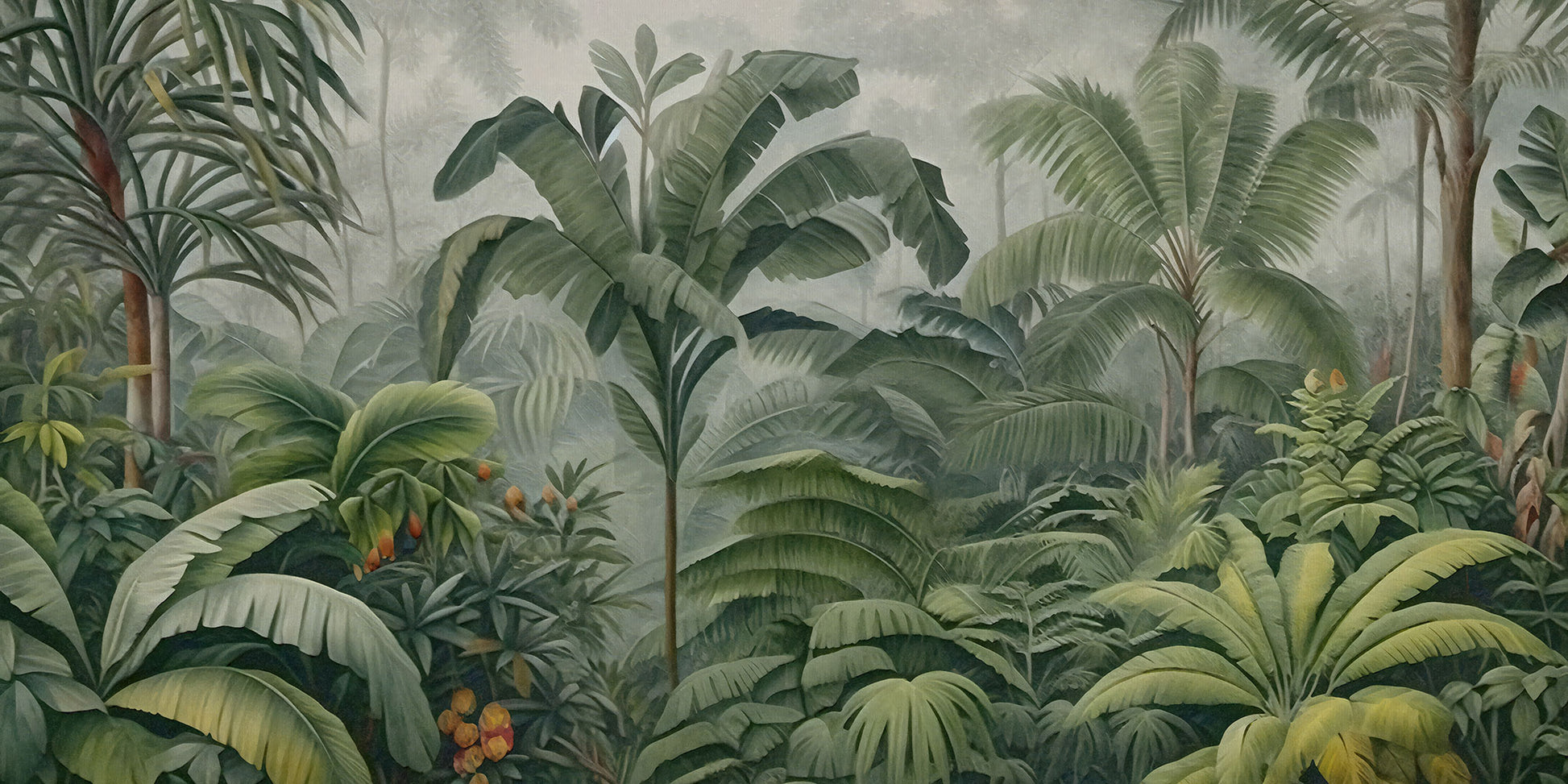 Wzór przedstawia soczystą roślinność – od rozłożystych liści palm, przez miękkie paprocie, po subtelne akcenty owoców w ciepłych odcieniach mandarynek. Zieleń ma tu dziesiątki odcieni – od głębokiej butelkowej po pastelowy seledyn, a lekka mgiełka tła dodaje całości malarskiej głębi.