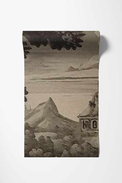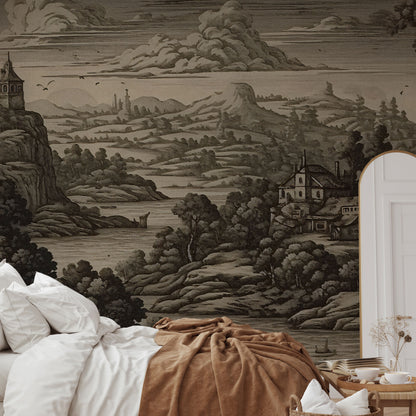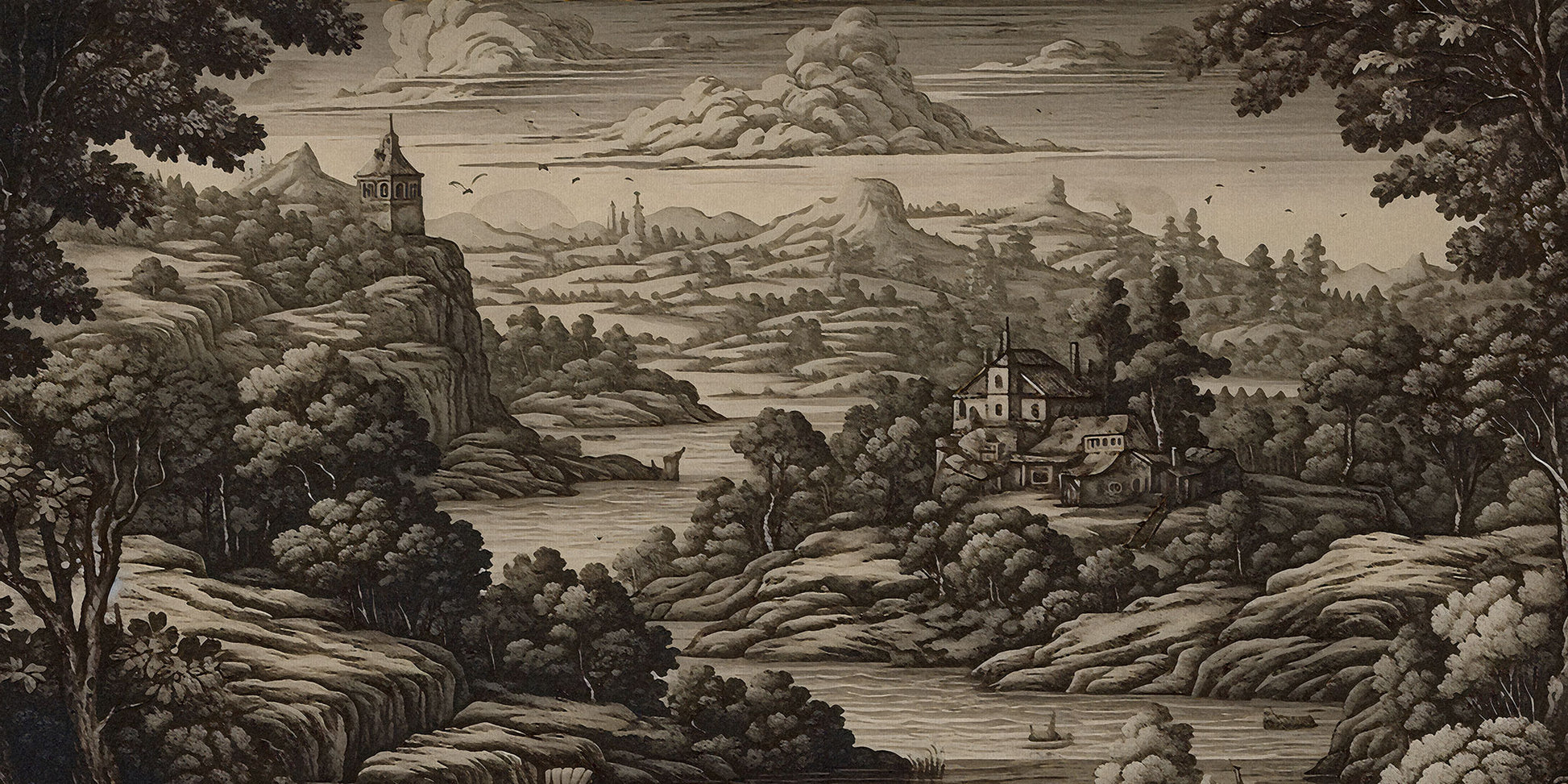„Vista” to tapeta, która przenosi do świata dawnych rycin i sepiowych pejzaży, gdzie czas płynie wolniej, a przestrzeń ma głębię i znaczenie. To hołd dla klasycznej sztuki krajobrazu – harmonijnej, wyważonej, pełnej detalu i melancholii.