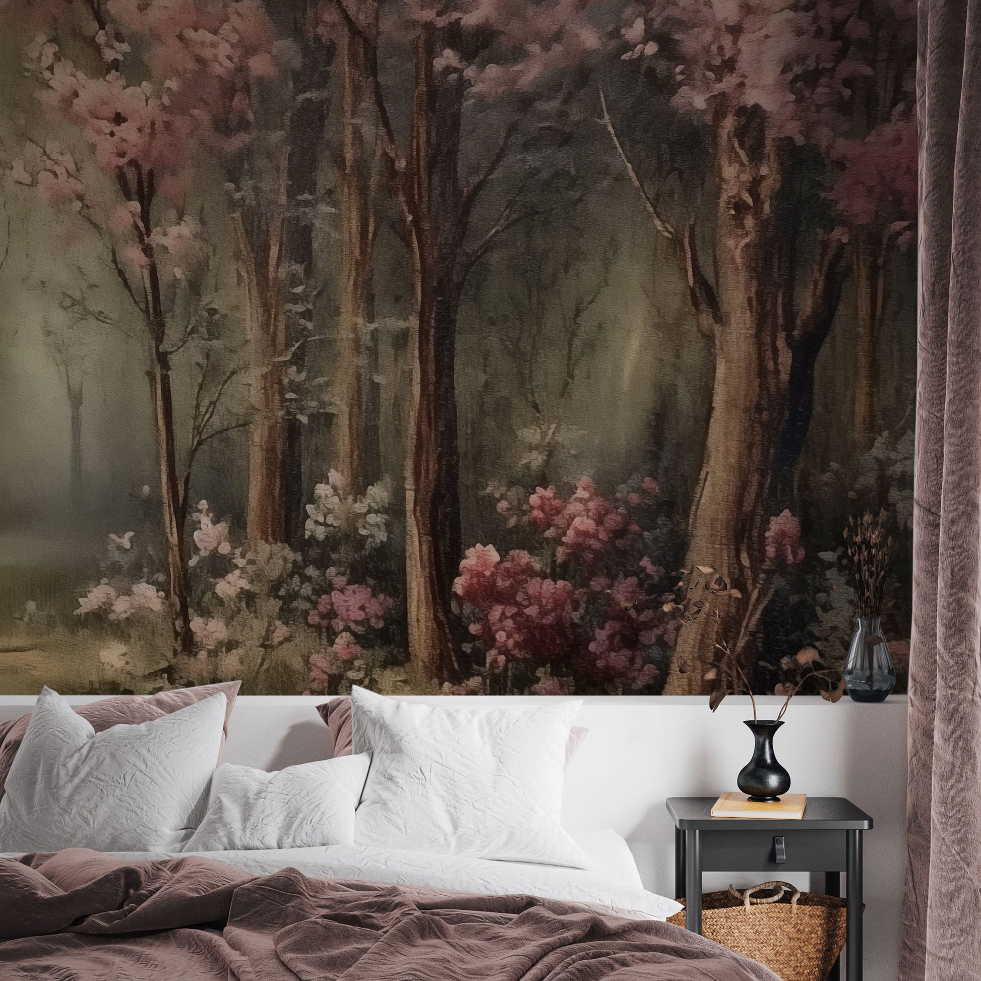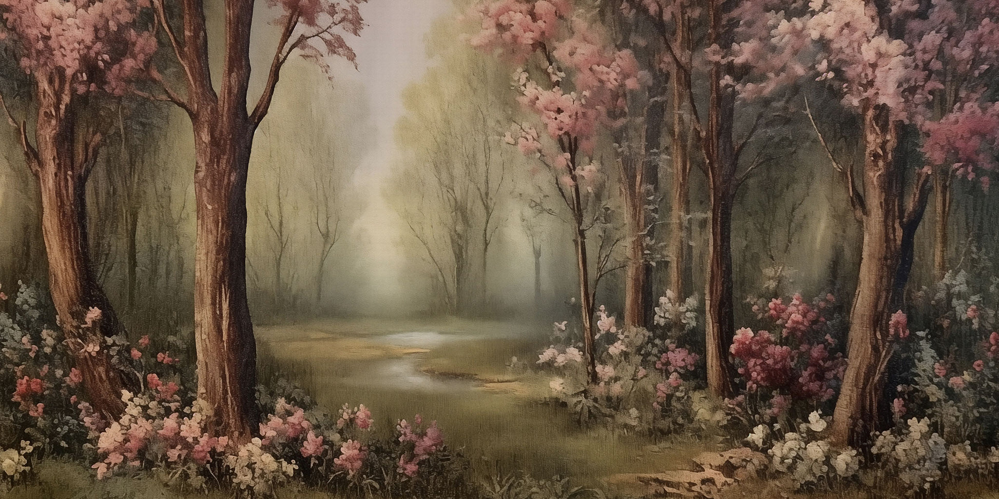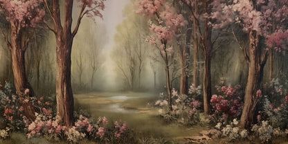 „Zakura” to tapeta, która przenosi w świat spokoju, światła i delikatności. Jej kompozycja przypomina romantyczny pejzaż malowany miękkim pędzlem – z drzewami kwitnącymi różem i pastelowym światłem rozlewającym się po leśnej polanie. To subtelna oda do natury, w której każda gałąź i każdy promień światła tworzą harmonijną całość.